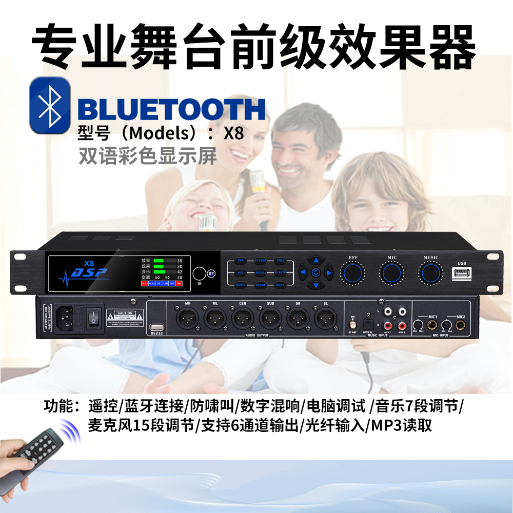 三级防啸叫/数字混响/电脑调试/数字面板操控/三话筒输入/音乐7段调节/麦克风15段调节/支持6通道输出